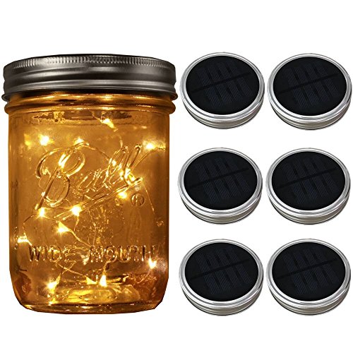 Wide Mouth Solar Mason Jar Lids Insert Light Mason Jar Lids Ring Hanger Not IncludedFits for wide mouth mason jar 3 in 76 mm inner and 3 38 in 86 mm outer diameter put the solar panels with string lights into the jar lids ringSwitch on the old fashioned warn white luminous points emerge through the mason jar just like the unforgettable fireflies glow makes your surroundings romantic and fairySpecifications Magnificent copper wire with 20 small warm white bulbs makes your surroundings romantic and fairyAn easy OnOff switch underneath the lid generally charge in the sun 6 8h will light up 24h slide the switch to the ON positionLong lasting LED bulbs little heat safe to handle even after long time useEnvironmental Protection and Energy Saving A 100 solar powered solar panel requires no external wiring so its easy to get it all set up Turn it on when it is charged under sunlight or bright shade A built in light sensor guarantee that it turns on at dusk and turn off by dawn automaticallyIntegrated Design Better Waterproof Rank Integrated design wont let moisture percolate through the solar panels and O shape seal ring wont let moisture get into the jars Good idea for DIY outdoor garden patio deck wedding party Christmas decorationsVersatility A magic jar NOT INCLUDED with fireflies glow is perfect for indoor and outdoor decorationPopular for modern Wedding kids room bathrooms dinner table parties cafe showcase birthdays holiday festivals anniversaries courtyard camping and daily ornamentationEasily hang on walls or in the air also can put it on shelves tables porches trees patios and pergolasA great gift to children lovers family and friends Manufacturer: CHBKT; Model: ; MPN: ; Part Number: ; UPC: ; Color: Warm White; Brand: CHBKT; Department: ; Size: 6 PCS Wide Mouth lids NO Jar Handle; Warranty: ; Label: CHBKT; Amazon Sale Rank: 26913;