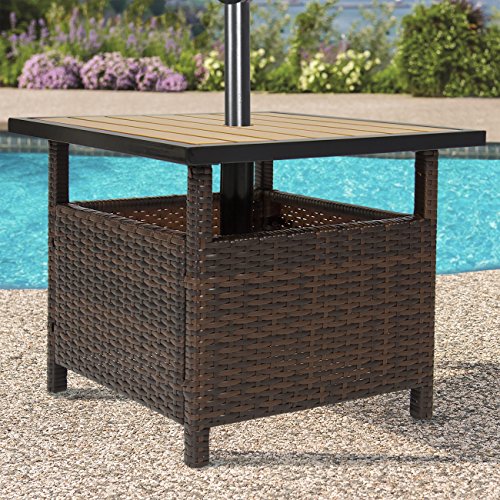 Made of durable UV and weather resistant wicker a wood tabletop and a steel frame keeping it safe from the suns harmful raysSturdy and versatile umbrella stand holds patio umbrellas that have up to a 15 inch pole diameterLightweight compact design makes it convenient to place anywhere around your patio or poolsideThe wood top provides an attractive contrast and gives the table a hard surface to place drinks snacks or decorOverall Dimensions 215L x 215W x 18HMore Info and Reviews Manufacturer: Best Choice Products L G DROPSHIP; Model: SKY2475; MPN: SKY2475; Part Number: SKY2475; UPC: 810010027788; Color: brown; Brand: Best Choice Products; Department: ; Size: ; Warranty: 60 day warranty; Label: Best Choice Products L G DROPSHIP; Amazon Sale Rank: 20496;Buy On Amazon