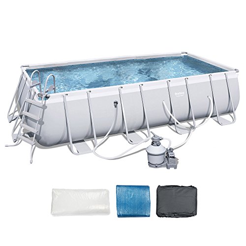 Beat the summer heat and have some fun in the sun with this Bestway 18 Foot x 9 Foot x 48 Inch Rectangular Frame Pool Set. This set comes with everything you need to enjoy a cool afternoon in your backyard including the pool a ladder 1 000 gallon sand filter pump ground cloth and pool cover. The soft gray laminated pool liner brilliant white copings and pool water blue tile print interior make a fashion statement anywhere. The steel frame sections with their unique rectangle shapes slip and lock together with ease. Add summer fun and beauty to any backyard with this luxury pool and accessories. Set includes: Pool ladder 1 000 gallon sand filter pump ground cloth and pool coverRust resistant metal frameHeavy duty PVC and polyester 3 ply side wallsFlow control connectors for rapid connectionFor outdoor use onlyMore Info and Reviews Manufacturer: Bestway; Model: ; MPN: 74877; Part Number: 74877; UPC: 821808564682; Color: grey; Brand: Bestway; Department: ; Size: ; Warranty: ; Label: Bestway; Amazon Sale Rank: 160912;Buy On Amazon