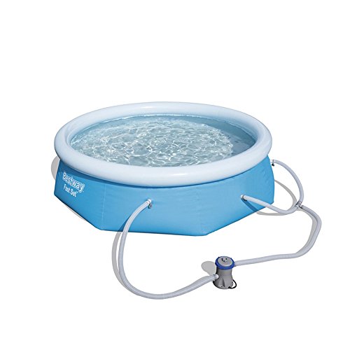The Bestway 8 Feet x 26 Inches Feet Fast Set Pool is a great pool for families who want the summer fun of having a pool without all the work and maintenance of an in ground pool. It’s the perfect size for kids to swim in and still be safe and for adults to hang out and cool off. It’s spacious enough to fit more than 1 but small enough to fit into more modest backyards. This Feet Fast Set Pool is simple to set up and only takes about an hour to fill. Inflate with top ring with an air pump (not included) and fill the base of the pool with water. The outer wall will rise as the pool fills. Make sure your ground is level otherwise the water may spill out. Once the pool is at its capacity about 80% full you’re free to hop in. This pool comes with a DVD with detailed set up instructions. This pool walls are built to last manufactured with 2 layers of heavy duty PVC and a polyester 3 ply wall in between. The flow control valve makes filling or draining the pool a snap. The pool’s liner is supported with an inflatable top ring. The Bestway Flowclear 330 GPH Filter Pump removes dirt and debris from your pool. The filter cartridge and connection hoses are included with the pump so it can be set up right away. The filter works best if cleaned daily. Start enjoying your summer with your friends and family in the Bestway Fast Set Pool. Includes 1 pool 58382US filter pump 110 120V 330 gal pump water flow rate 280 gal integrated pool system water flow rate compatible with cartridge 58168 110 120VExtra strong side walls are made with 3 separate layers of material The inner layer of polyester mesh is laminated to the 2 outer heavy gauge PVC layers This creates a total thickness of 040 080 mm 16 32 gauge depending on the size of the poolEasy set upHeavy duty PVC and polyester 3 ply side wallsLiner is supported by an inflatable top ringMore Info and Reviews Manufacturer: Bestway; Model: ; MPN: 88438 1; Part Number: 88438 1; UPC: 821808572670; Color: blue; Brand: Bestway; Department: ; Size: ; Warranty: ; Label: Bestway; Amazon Sale Rank: 70471;Buy On Amazon