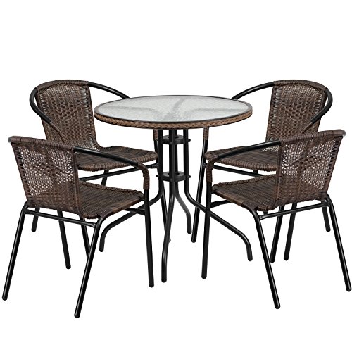 Arrange your perfect outdoor space with this glass table set. This set will enhance your bistro cafe restaurant hotel or home patio space. The rippled designer glass top has a smooth surface for keeping items level. The rattan edge band adds just the right touch to set it apart. The lightweight chair features a curved back and a comfortable rattan seat. For easy storing and cleaning purposes these chairs stack up to 23 chairs high. This set was designed for all weather use making it a great option for indoor and outdoor settings. For longevity care should be taken to protect from long periods of wet weather. Whether you are just starting your business or upgrading your furniture this set will complete the look. Table and Chair SetSet Includes Table and 4 ChairsDesigned for Indoor and Outdoor UseDesigned for Commercial and Residential UseRound TableTable Size 2875W x 2875D x 28HTop Size 28 RoundBase Size 1975W5mm Thick Glass125 Edge TopMore Info and Reviews Manufacturer: Flash Furniture; Model: TLH 087RD 037BN4 GG; MPN: TLH 087RD 037BN4 GG; Part Number: TLH 087RD 037BN4 GG; UPC: 889142061656; Color: Clear Dark Brown; Brand: Flash Furniture; Department: ; Size: 28 ; Warranty: 5 year limited non moving metal parts 2 yr parts ; Label: Flash Furniture; Amazon Sale Rank: 376100;Buy On Amazon