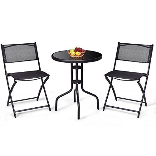 Reinforced Glass Design The reinforced glass table top greatly increases the durability compared to regular glass The glass table is also easy to clean and scratch resistantFoldable Chairs Foldable chairs are convenient for transportation and storage saving space for you It is the perfect way to enjoy a cafe style experience right outside of your door with this setSturdy Durable With premium painted metal construction this set is rust resistant and UV resistant The table base has four claw shaped legs which makes it sturdy and steady on groundSuitable For Home Using It is easy to wipe clean with normal household wipes You can enjoy meals drink with this set and have a good leisure time Simple and chic style is a perfect decoration to your garden patio bistro or roomConvenient Use No assemble for the chair only easy assemble for the tabels with all hardware packed in the package The charming color creates an elegant and graceful atmosphere for your bistro or patio easily blending into any indoor or outdoor settingMore Info and Reviews Manufacturer: Giantex; Model: OP2990; MPN: 3 pcs Bistro Folding Chairs; Part Number: 3 pcs Bistro Folding Chairs; UPC: ; Color: Black; Brand: Giantex; Department: ; Size: Table 24 D x28 H Chair 18 L x20 W x34 H ; Warranty: ; Label: Giantex; Amazon Sale Rank: 10160;Buy On Amazon