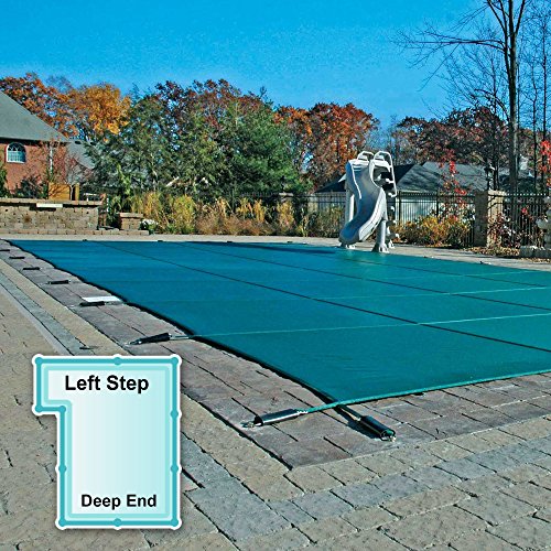 Economy Safety Pool Covers are made out of a two ply mesh material that resists rot mildew sunlight and harsh chemical damage. Many people use this cover year round on their swimming pool not just as a winter pool cover. Its mesh construction allows for water drainage while keeping unwanted leaves and large debris from entering the pool. Each swimming pool cover comes complete with brass screw type anchors for concrete decks stainless steel springs installation tool and storage bag. Initial installation of anchors will require a rotary hammer drill and 3/4 inch drill bit. Cover is ASTM rated and has a break strength of 4 000 pounds. 12 year warranty. Step section side (right or left) determined by standing at the deep end looking towards the shallow end.YOUR POOL MUST MEET THE FOLLOWING REQUIREMENTS TO PROPERLY INSTALL A SAFETY COVER: