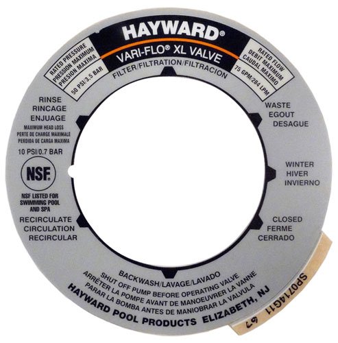 Hayward SP714T Valve Position Label SPX0714G. The handle position label for the SP714T top mount multiport valve used on Hayward Pro Series sand filters. Replacement 6 position multiport valve label fits the SP714T valve only to replace a hard to read valve position label. Made by Hayward. More Info and Reviews Manufacturer: Hayward; Model: ; MPN: SPX0714G; Part Number: SPX0714G; UPC: 610377210249; Color: ; Brand: Hayward; Department: ; Size: ; Warranty: ; Label: Hayward; Amazon Sale Rank: 27867;