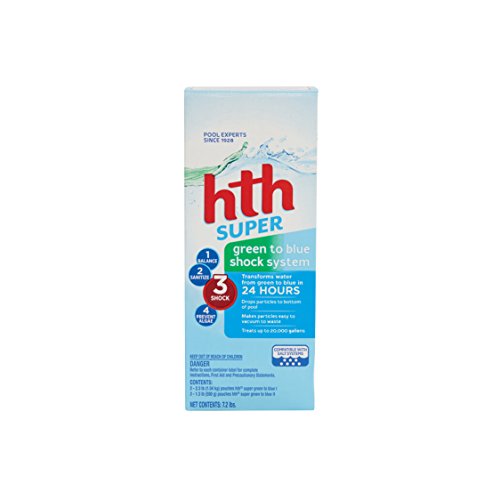 At the start of the season or if a severe algae bloom occurs. during the season the pool can be treated and. returned to its clear blue appearance within 24 hours. by using the hth super green to blue shock system. hth super green to blue II is a flocculent that will. help clear your pool by dropping particles to the. bottom of your pool. At the start of the season or if a severe algae bloom occurs during the seasonHth super green to blue II is a flocculent that will help clear your pool by dropping particles to the bottom of your poolTransforms water from green to blue in 24 hours. Drops particles to bottom of pool. Makes particles easy to vacuum to waste. Treats up to 20 000 gallons. Compatible with Salt SystemsMore Info and Reviews Manufacturer: HTH; Model: 52009; MPN: 52009; Part Number: 52009; UPC: 641785852394; Color: ; Brand: HTH; Department: ; Size: 1 Pack; Warranty: ; Label: HTH; Amazon Sale Rank: 2625;Buy On Amazon
