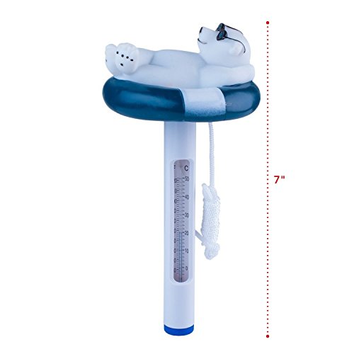 Thermometer is 7″ tall and reads in both F° and C°Includes rope tether to keep the thermometer from floating awayBear shaped top adds fun and décor to your poolMade from durable ABS plastic to last from season to seasonNo more guesswork with accurate temperature readings