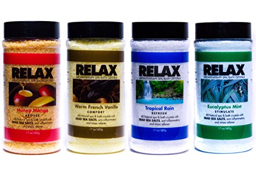 Relax Spa & Bath crystals will enhance any spa or bath experience. Whether it is romance peace of mind or well being that you are seeking Relax Spa & Bath crystals help set the mood arouse emotions and relax your state of mind. Simply add the desired dosage of our naturally colorful and full of fragrance crystals to your spa or bath to obtain the desired aroma level. Relax Spa & Bath crystals are designed for spas hot tubs jacuzzi and whirlpool baths as well as rejuvenating baths aroma showers shower salt scrub and pedicure soaks.