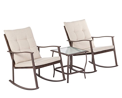 Solaura Outdoor Furniture 3 Piece Rocking Wicker Bistro Set that includes two rocking chairs with cushions and a glass coffee table.